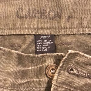 Used pair of olive green jeans for men by Carbon. Belt included. Please feel free to ask any questions:) waist fits more like a 33