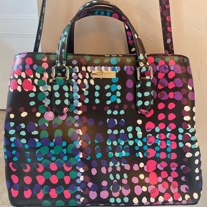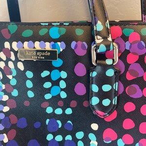 Beautiful multi color Kate Spade purse. Can be used as tote or shoulder bag. Three inside compartments, three pockets, one zipper enclosure. Minimal wear on bottom. No damage or scratches to any other part of bag. Faux leather material. 12in long, 9 in high. Handle drop is 4in. Adjustable strap.