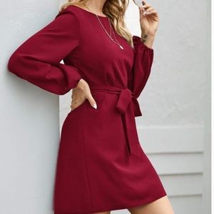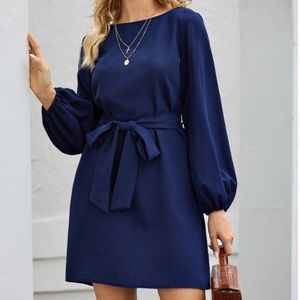 Navy blue lantern long sleeve belted mini dress