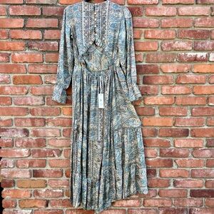Distressed blue jean full length jacket. Long coat length with hardcore "stressing" on both the front and back. Metal antiqued buttons. NEW.