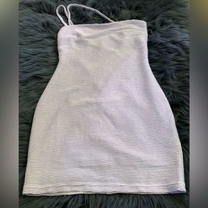 From the Reverie Collection. Designed with raised ribbing and finished with a subtle sheen, this asymmetric mini dress has a bodycon silhouette.