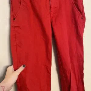 Red “denimish” like pants with zippers on the ankle area. Rad little silver custom L.A.M.B. buttons and logo and patch details, super comfy, my fatass just can’t squeeze into them anymore.