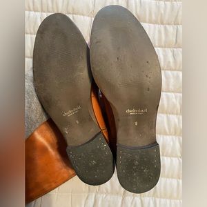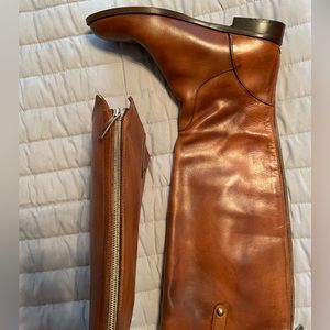 Brown genuine leather riding boots. Size 8-runs big. Shaft length 16”. Calf circumference 14”. Gold zipper up the back. Made in Italy.