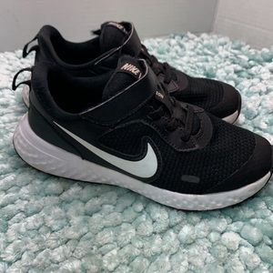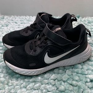Nike Revolution Black & White Athletic Training Running Sneakers Girls Boys Run Workout Dance Dancing Hip Hop Class School PE Gym Physical Education Cheer Cheerleading Practice Tennis Sport Sports Track Elementary School Runner Comfort Comfortable Lightweight Slip On Easy to put on No shoe laces to tie Velcro