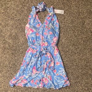 Navy long sleeve tee with small hot pink logo on front, large hot pink logo on back, & hot pink logo/detail along sleeve!