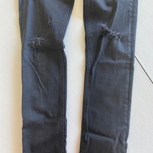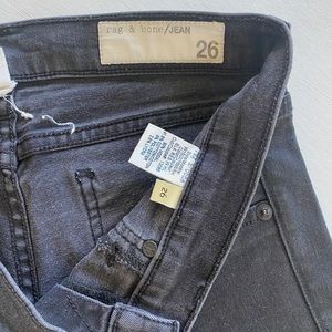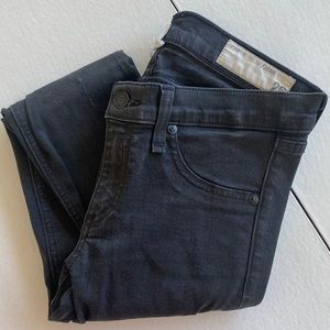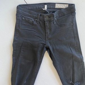 Rag & Bone brand mid-rise skinny style black denim jeans with distressing on the knees. Size 26. Rarely worn and in great condition!