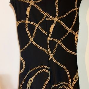 Black dress with gold chain link design;