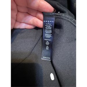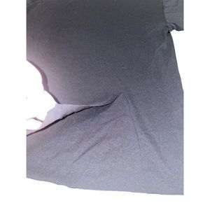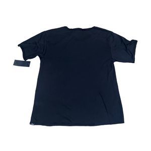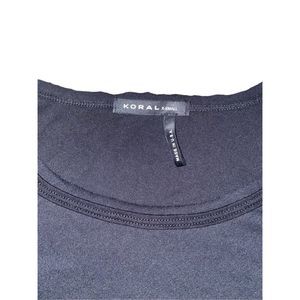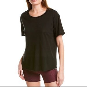 This is a listing for one tee by the brand Koral in size XS. The tee is the Essential S/S T-Shirt. It is a black tee with a raw bottom hem and stitched neck and sleeve hem. There is a slit at the back right of the shirt. The material blend is 85% cotton and 15% tencel making it super soft. It is really light weight and would be great for daily wear or workouts.