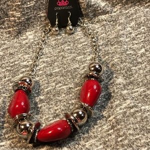 🥰 Short chunky necklace with matching earrings. A darker brick red.