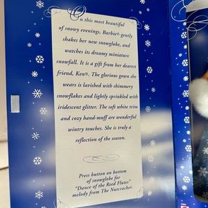On this most beautiful of snowy evenings, Barbie gently shakes her new snow-globe and watches its dreamy miniature snowfall. The glorious blue gown she wears is lavished with shimmery snowflakes and lightly sprinkled with iridescent glitter. The soft white trim and cozy hand-muff are truly a reflection of the season.