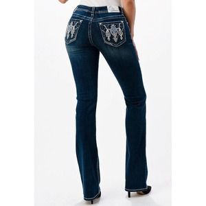 The Grace in LA women's bootcut jean in Easy Fit shows off your best shape by featuring a higher rise. The denim fabric features a softer and higher stretch for exceptional comfort all while maintaining a denim look. The mid-rise creates a form-flattering fit for every curve. The jean is detailed in a steerhead Aztec embroidered design on the back pockets with crystal embellishment, added embellishment on the front pockets, natural hand-sanding, and whiskering. They look like they've been yours forever.