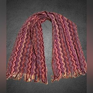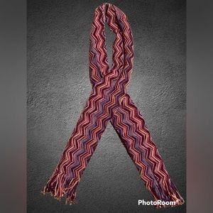 Lightweight scarf with fringe on ends in multicolored zigzag pattern of purple, lavender,pink ,red ,and peach .