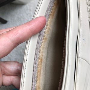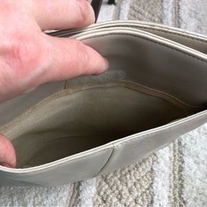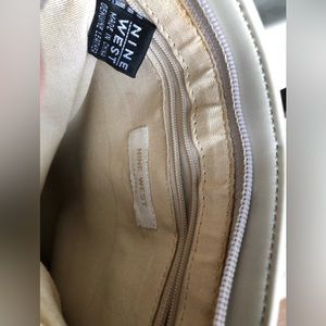 NineWest brand, light beige genuine leather cross body bag. The front face of the bag is in great shape, a nice quality leather, has some small dye transfer spots and no bad scratches. The inside of the main compartment has glue color bleed through along the top inside edge. The back of the bag has a nice extra deep pocket with a Velcro closure. The bag does have numerous dye transfer spotting on the back side. It is thick leather and sturdy.