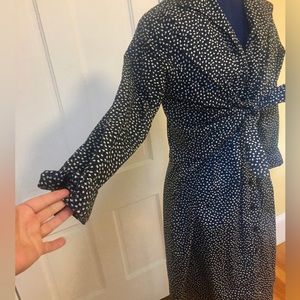 Our fitted style dress, the Lauri has a classic, feminine silhouette with a knotted waist detail, a deep modest v-neck, and a sleek stand-up collar. Perfect for work days to dinner with friends.