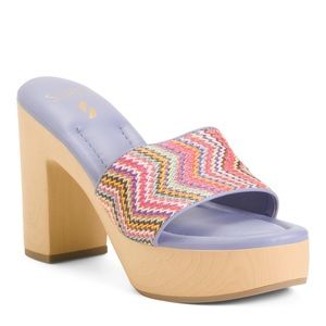 one band, raffia accent, wood block heel, comfort footbed, platform style, size chart conversion may vary slightly by country
