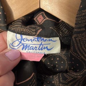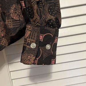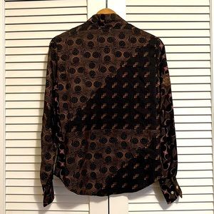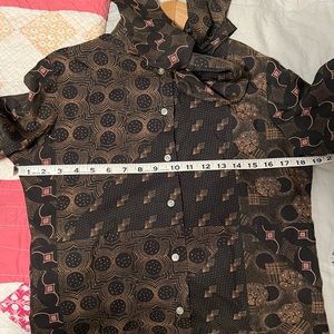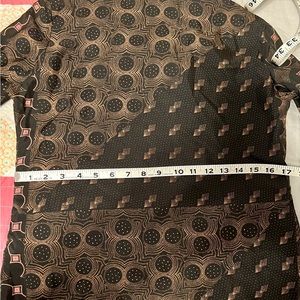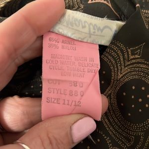 The size tag reads 11/12, however it fits like a 4/6. The brown and pink pattern is super cool. Fabric is thin and silky smooth. Measures 25.5” from collar to back hem. Great condition no snags, stains or holes.