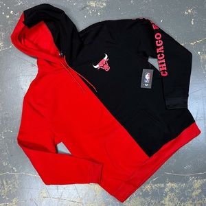 I’m selling a Brand New with Tags UNK brand NBA Chicago Bulls Retro Pull Over Hooded Sweater In split Black and Red with White printed logo!