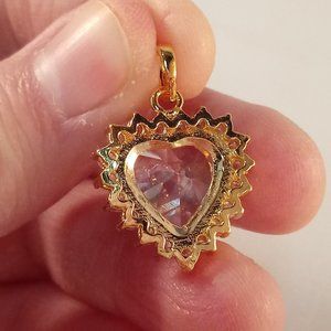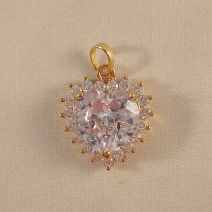 Beautiful classic gorgeous luxury halo design heart shape full crystal zircon necklace pendant 18K yellow gold plated w/a large sparkling heart shape + smaller round clear white simulated diamond zircon gemstones. Top quality, high polished shine, brand new, never been worn. Lead, nickel free. This pendant sparkles beautifully.