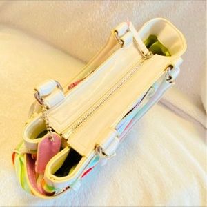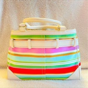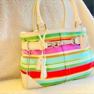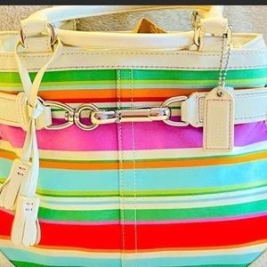 It has Beautiful Bright Different colored stripes that surrounds the purse