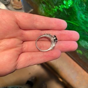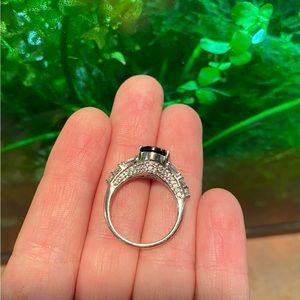 Black spinels are really beautiful gems! As opposed to black diamonds, which are often dyed, black spinels are all natural and highly reflective. This sparkling, ornate ring has glittering natural zircons encrusting a platinum layer over sterling silver (marked 925). The four-prong setting contains a beautiful 4.00ct (approximate) natural oval black spinel—black spinels are rare, and are strong gems with an 8 Mohs hardness rating (10 being the highest). The stone is checkerboard cut to really grab the light (pictured here is green reflections from a fish tank—there’s no green in the stone itself), and measures approximately 11mm by 9mm. This black spinel—as a natural gem—has one surface-level inclusion (about a pinpoint-sized cream dot, circled in green, and not very noticeable—please see video). Any questions, please ask! I bought this ring setting (marked D’Joy 925) and gem separately because I thought they’d go so well together; this ring is One of a Kind (OOAK), size 8, and New Without Tags (NWOT).