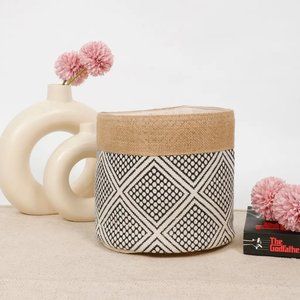 Jute Cotton fabric printed basket, squares, 8x8, off-white, brown, black
