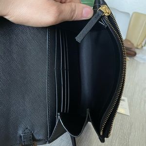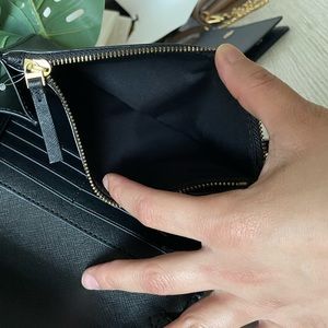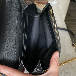 Details: 8 Credit Card Slots and One zip compartment Gold-tone hardware Slip pocket on back Fully lined Removable chain/leather shoulder strap with approx. 22" drop