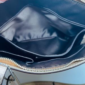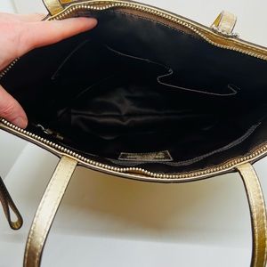 Stunning in appeal and simple in design, this tote by Coach will be a valuable addition to your closet. Crafted from metallic gold logo-embossed leather, it features logo detail on the front and a commodious silhouette. The bag comes with a satin-lined interior that will hold all your belongings and is complete with top handles. Interior satin lining is in mint condition and bag is EUC with hardly any signs of wear. Large interior zip compartment and 2 other compartments for phones/batteries etc. Used less than a dozen times.