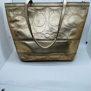 Coach Metallic Gold Signature Stitched Leather Tote For Women EUC