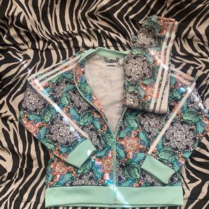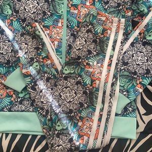 Adidas set the jacket is an small and the leggings are xs. They are 2 different textures. A free gift comes with it