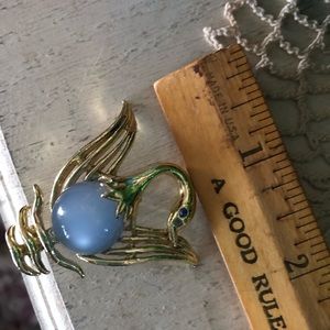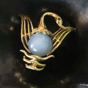 Vintage gold-tone Swan Jelly Belly Pin with a light blue moon glow belly and crystal rhinestone eye. I believe it to be an unsigned GERRY’s piece. Measurements shown in photos. In excellent preowned vintage condition. Smoke-free home.
