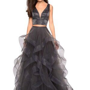 Details: Sleeveless, Embroidery, Fitted bodice, Open V back, Back zipper, Fit and flare, Illusion, Court train