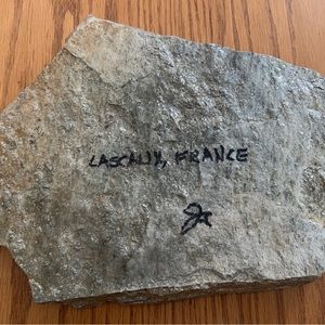 One of a kind piece. Beautiful horse painting on stone; piece of shale that weighs approximately 10 lbs. A reproduction of the cave art found in France. Tabletop decor piece with original stand included.