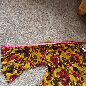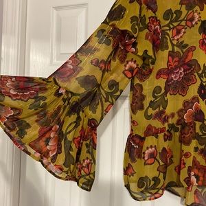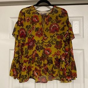 Only worn a few times and is in great condition!! This blouse is so fun and has ruffles on the shoulder, sleeves and bottom of the shirt. It has a tie at the check area. This shirt is sheer so a tank or bralette would need to be worn underneath.