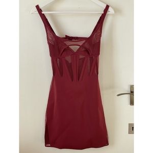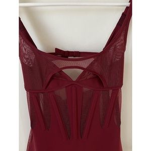 Mugler Mesh-detail scoop-neck stretch-woven corset style mini dress in Merlot (wine red)