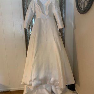 Structured, A-line gown in glossy Mikado, fit with a bateau neckline, a sleek waistband, and regal sleeves dotted with intricate, pearly embroideries. Color is listed as off white, it's not quite white, but not really ivory either.