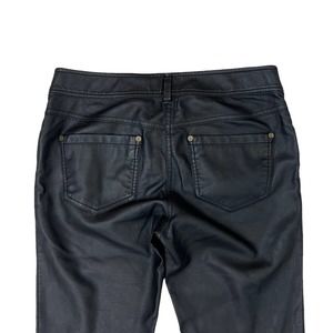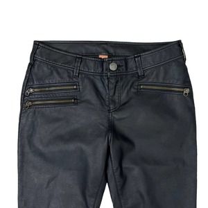 Size 4. Solid black color. Three zipper pockets on front, two open pockets on back. Zip fly and button closure. Mid rise. Has belt loops. Zip ankle detail. Stretch faux leather material.