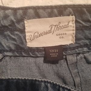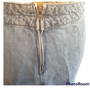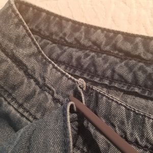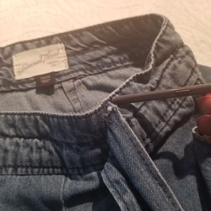 University Thread demin capris with pleats in the front. Back zipper. Two front pockets. Belt ties in the from, some of the stitching is loose at the top of the belt. It doesn't affect the wear. Great used condition. 31 inch waist. Smoke free home.