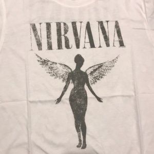 Vintage styled band tee ‘Nirvana’ with winged angel. Soft comfortable material with a little stretch.