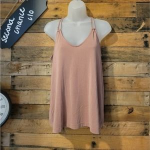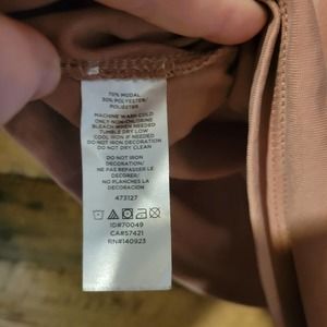 dusty rose (in the pink family colors) has a swing bridge style neckline in the back. it will adjust if you want it close together or spread out for comfort. has spaghetti straps for the front part. has a soft V neckline. the material is soft to the touch. this will be a little more fitted at the top then flare out. there is a small pull on the left near the seam. the way the top lays it actually hides it. found. k other issues or flaws. smoke free home and pet friendly home.