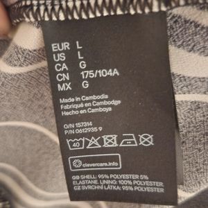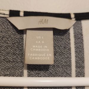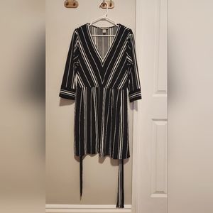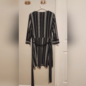 H&M black and white striped dress. The dress also has a v-neckline, 3/4 sleeves, and an empire waist with a tie belt. The length of the dress hits just above the knee. The material is 95% polyester and 5% elastane, and the dress itself is very stretching and comfortable to wear. There is no damage or stains. Getting rid of this item as it is no longer my size.