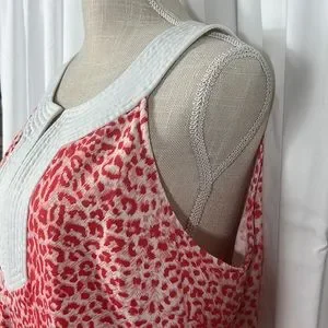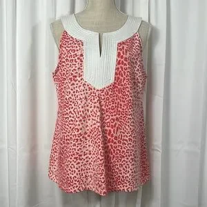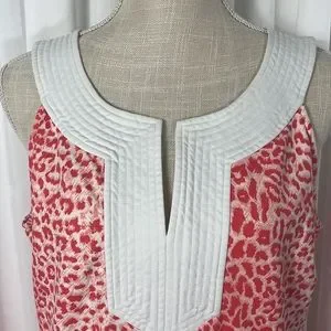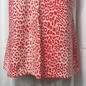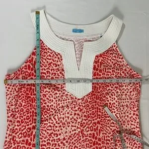 Women’s white and red animal print, sleeveless, v-neck, stretchy, J. McLaughlin blouse. Size X-Large, excellent used condition. 91% nylon, 9% spandex.
