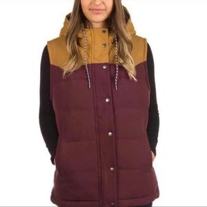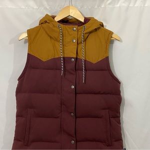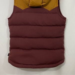 Patagonia Bivy Hooded Full Zip Colorblock Down Filled Puffer Quilted Vest in Maroon Tan Gold Rare Color Way