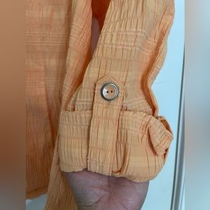 This is a very lightweight jacket. The colors is a peachy orange.
