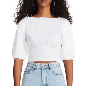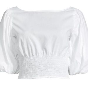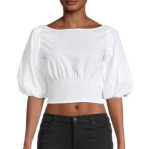 NWT BB DAKOTA SMOCKED PUFF-SLEEVE COTTON POPLIN TOP WHITE SMALL