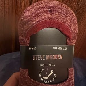 Steve Madden Women Foot Liners, 5 pairs, new in package. No Slip Silicone Grip on back top of foot liners. Womens shoe size 5-10. Cute & stylish, five different, pretty colors. From smoke free home.