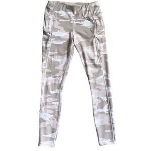 Super cute athletic leggings - perfect for working out, running or just a casual look. White, cream and tan camo print is a great light neutral color. Side zip pockets. 7/8 length with approx 24 inch inseam. Inside card pocket. Breathable and wicking.