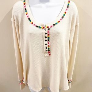 - Oversized comfy thermal with rainbow colored embroidery along neckline and cuffs.