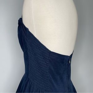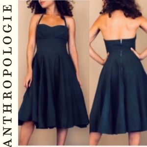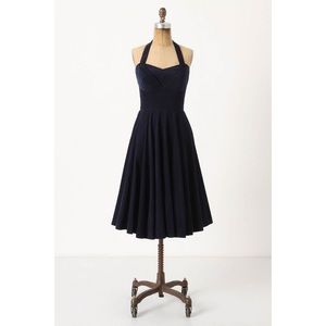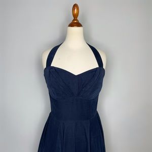 Girls from Savoy for Anthropologie Ronda Halter Midi Dress in Navy Blue Corduroy. Excellent condition without flaws and truly a piece you’ll reach for time and again. Super flattering and classic. Retro pin-up styling with a timeless romantic flare. Fitted at the bodice and then flares out into a full skirt. Bodice is pleated with an adjustable, removable halter strap, and smocked, elasticized side panels.