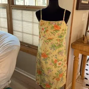 Empire waist. Gorgeous pale yellow print with orange and white hibiscus. This dress has a little Lycra in it for stretch. Adjustable straps. Back kick pleat. Screams summer!
