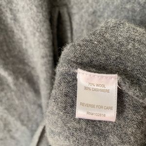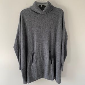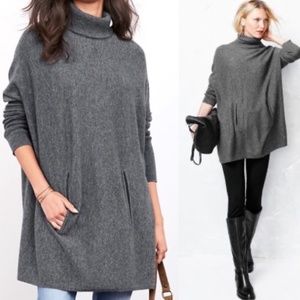 Garnet Hill wool cashmere blend gray turtleneck poncho tunic sweater with front pocket and ribbed sleeves and neck.